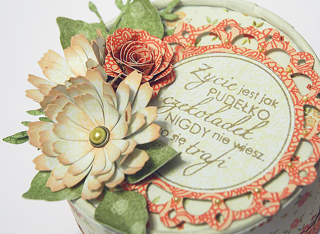 Wczoraj w oko rzuciło mi się stojące na półce i czekające na ozdobienie pudełko po serku camembert. Na wieczku umieściłam stempel-cytat z Agaterii, całość ubrałam w jasne kolory i delikatne kwiatowe motywy najnowszej kolekcji Galerii Papieru, a ożywiłam kilkoma dodatkami w koralowym odcieniu. Oto pudełko po liftingu: