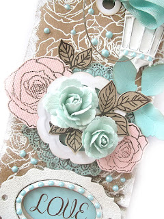 Na dziś przygotowałam dwa, niemal bliźniacze tagi. Ich bazą jest zwykła, gruba tektura falista - fragment dużego kartonu. Kolor tektury i jej faktura są bardzo inspirujące, zatem postanowiłam nie zakrywać jej żadnymi papierami ale za to stworzyć ciekawe tło z pomocą stempelków Agaterii. Całą powierzchnię obu tagów zapełniłam odbitkami stempli Róże + Listki 2, oraz Rozetka 1. Stemplowałam za pomocą tuszu do embossingu, a następnie całość pokryłam białym pudrem i roztopiłam wzory - w ten sposób powstały ażurowe, delikatne tła, których można by już wcale nie ozdabiać. Ja jednak nie poprzestałam na tłach i stworzyłam małe kompozycje z kwiatów i dodatków, które dopełniłam stemplowanymi na kolorowym brystolu różyczkami i listkami ze wspomnianego zestawu.