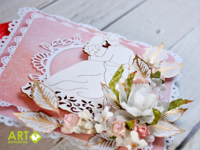 Tekturka Młoda Para 2 ma idealną wielkość, by zrobić z niej główny motyw na ślubnej kartce - tak właśnie się stało. Postanowiłam przystroić ją nieco złotymi listkami. Listki ozłociłam używając pudru do embossingu. Do papieru Magic Dreams 4/6 dodałam co nieco koronek i kwiatów, a w efekcie powstało to: