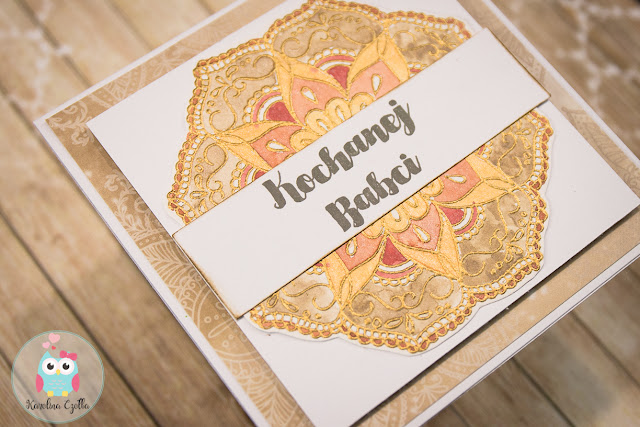 Today I'm sharing with you some ideas abut Mandala stamp. I really like large, multi - element stamps that can be used as a background or a focal point. It is rather rare for me to leave a stamp just stamped with some ink. If it is only possible I like coloring, change the form, create backgrounds and decorative elements. This is what the Mandala stamp gives you. I prepared a short tutorial video on which I will show you how to make two different cards using the same stamp. The form and layouts of the cards are identical but the colorsare different, the media I used are not the same and I did one more think. As you can see in the picture below the main decoration of my card is three - dimensional. Thanks to several images of the stamp I made , than coloured them and cut for pieces I was able to create a focal point which pop up from the background. On both cards I made heat embossing. At the end I added a stamps with sentences.