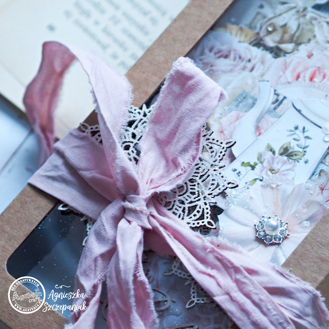 The card base from Rzeczy z papieru comes along with a matching box, which I also delicately decorated by adding a little cardboard and ribbon.