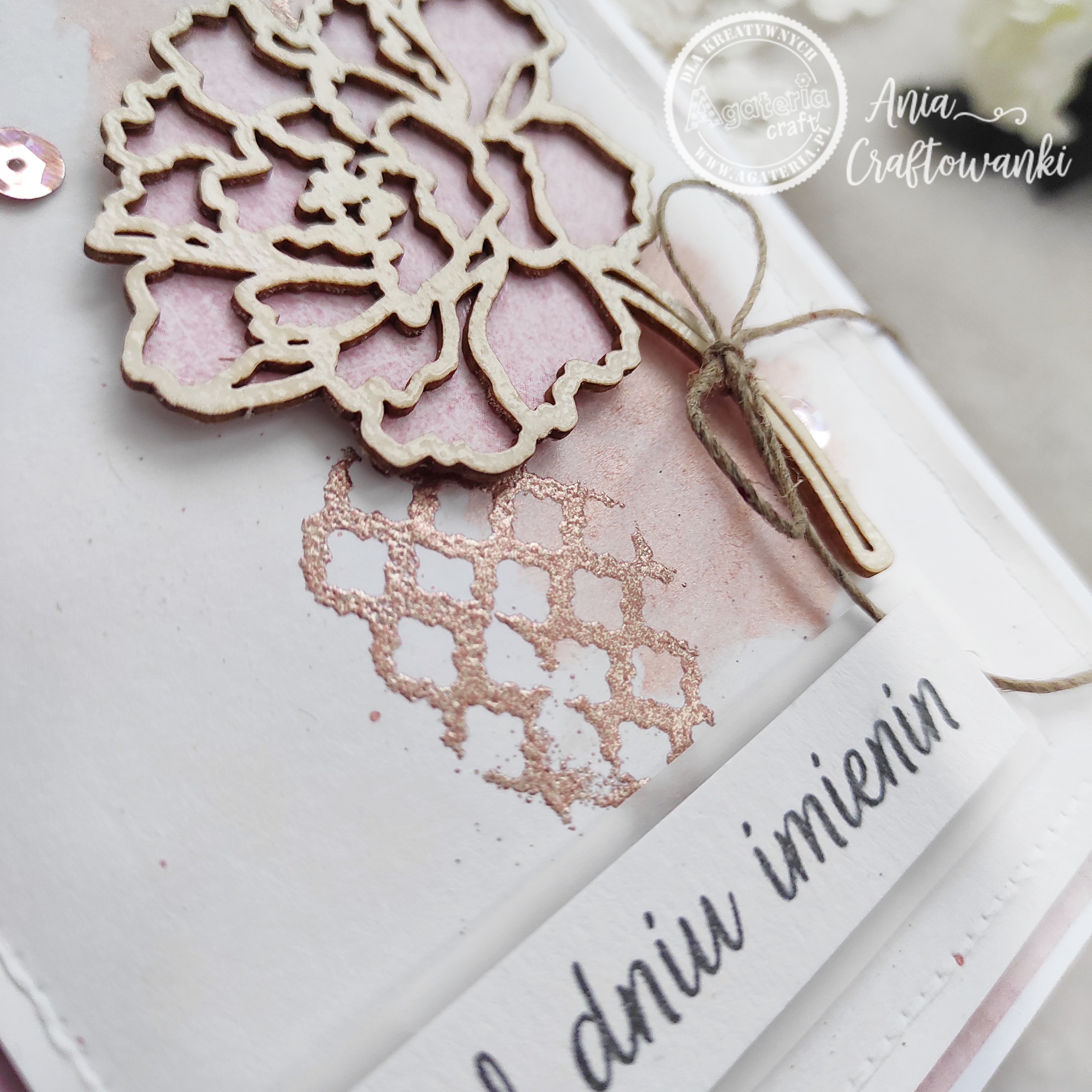G艂贸wny element to tekturkowa peonia. Bardzo lubi臋 u偶ywa膰 surowych tekturek, ale tutaj postanowi艂am zabezpieczy膰 ja prze藕roczystym embossingiem. Sp贸d podklei艂am r贸偶owym papierem i ozdobi艂am j膮 jedynie sznureczkiem